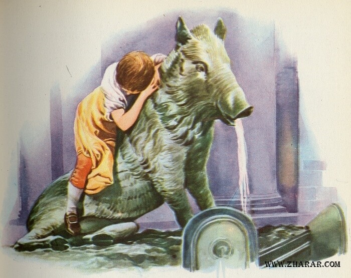 Бала бұл бейнеге басқалардың бәрінен де ұзақ қадалды, ал қола қабан оны тып-тыныш күтіп тұр; күрсінген дыбыс естілді; қайдан шықты суреттен бе, әлде қабаннан ба? Бала қабырғадағы мәз-мейрам сәбилерге қолын созып еді, астындағы хайуан ытқи жөнеліп, оны вестибюльдің бойымен әрі қарай алып кетті.