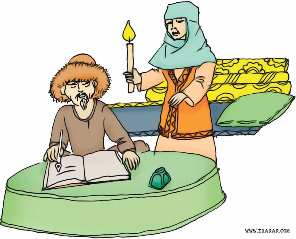 - дейді. Әйелі көңілін қимай төсектен түсіп, шам жағып береді. Сонда қолына қағаз, қалам алып: